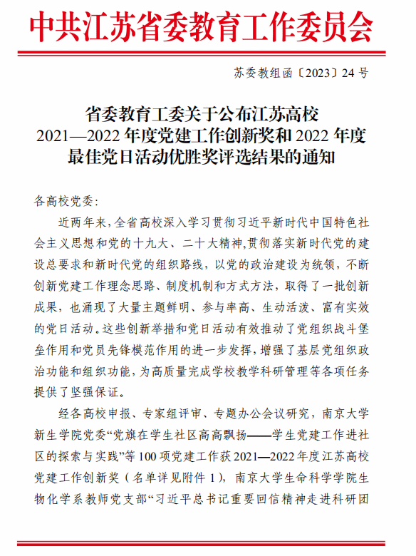 betway西汉姆联官网教工第一党支部获得江苏高校2021—2022年度党建工作创新奖二等奖
