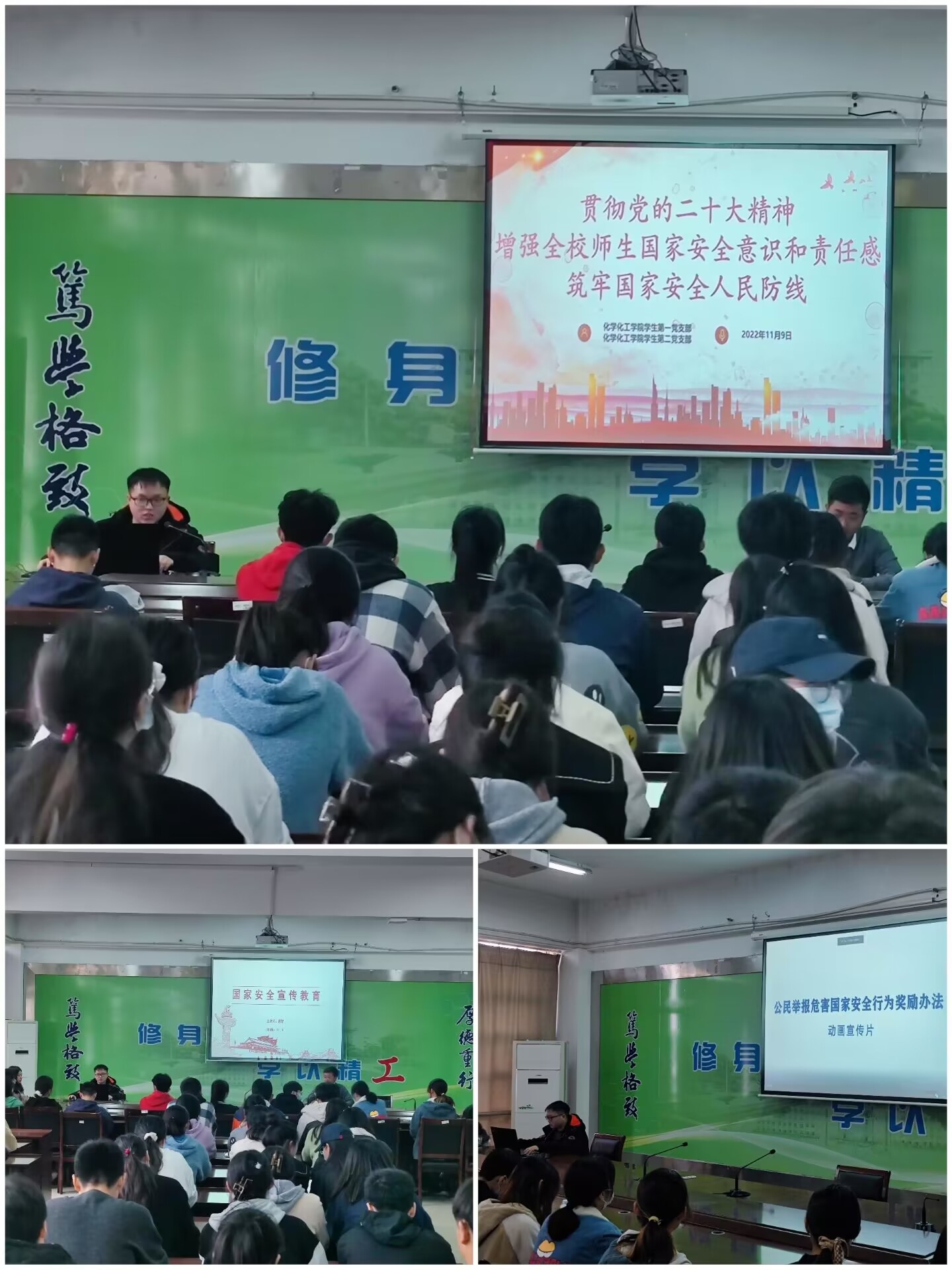 会议伊始,唐智带领全体学生党员学习《中华人民共和国国家安全法》、《中华人民共和国反间谍法》、《反间谍安全防范工作规定》和《公民举报危害国家安全行为奖励办法》等国家安全相关法律法规及其实施细则;随后,结合党的二十大报告中关于国家安全的相关内容进行宣讲,并带领全体学生党员学习党的二十大精神;最后,他带领大家一起观看《公民举报危害国家安全行为奖励办法》宣传片和《提高警惕 防范网勾》动画宣传片。他表示作为学生党员要绷紧国家安全这根弦,居安思危,不断提升维护国家安全的自觉性和主动性,为维护国家安全贡献智慧和力量。