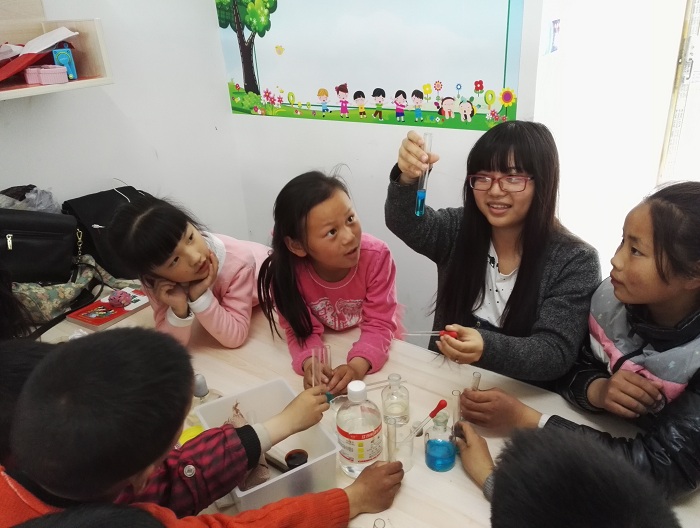 本次活动共分为“科学实验”与“趣味游戏”两个环节。本次志愿者共带给孩子们三个小实验:“白糖变黑糖”、“硫酸铜的沉淀”以及“魔棒点灯”。白糖颜色突然变黑、硫酸铜化为絮状沉淀、酒精灯不用打火机都能点燃这些实验现象都让孩子们感到十分神奇,争先恐后的表示想要自己动手进行这些试验。在为孩子们讲述完基本的实验原理后,志愿者通过亲手教学的方式,让每一个孩子都亲身体验到了魔术般的化学。为了让孩子“知其然”并“知其所以然”志愿者们给孩子们讲了产生化学反应的原理,并且提醒哪些是有危险性的化学药品,一定不能碰,为了证明硫酸的强腐蚀性,志愿者当场给孩子们看纸上滴浓硫酸的变化过程,看到几层的纸巾被浓硫酸迅速腐蚀穿透,孩子们发出惊呼。