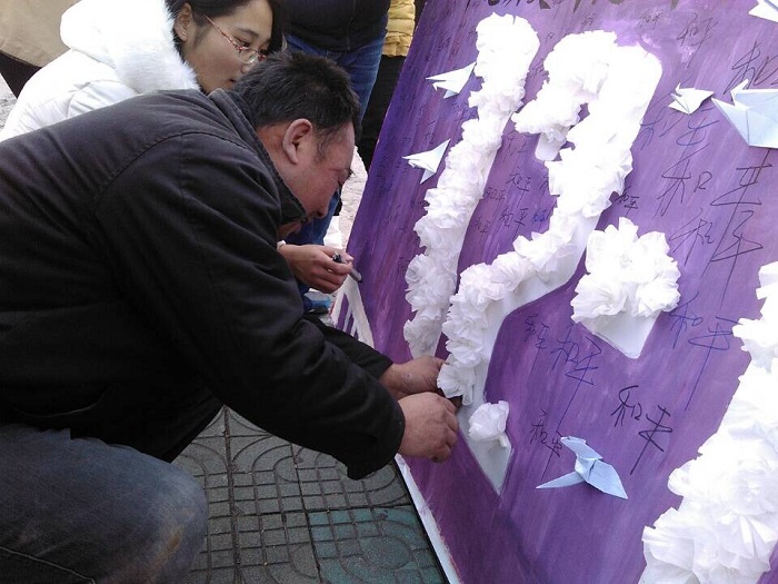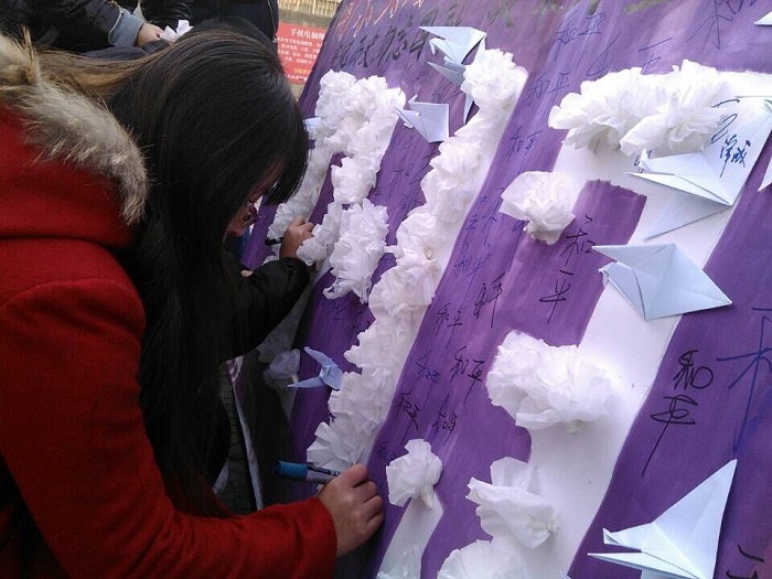 12月13日上午10点半,化生学院分团委在betway西汉姆联官网东校区移动营业厅门口举办了纪念“南京大屠杀死难者国家公祭日”的祭奠活动。 化生学院精心绘制了活动海报,并发动志愿者在活动前亲手制作白花和和平鸽。活动期间,化生学院展出海报展板,并将制作好的白花和和平鸽发给前来献花、贴和平鸽的学生,以祭奠在南京大屠杀事件中牺牲的30万死难者同胞。每一位前来祭奠的学生都抱着虔诚的心在展板上写下了“和平”,寄予了大家对和平的美好期望。 晚上7点,化生学院三十多名同学在操场为纪念南京大屠杀死难者同胞进行了烛光祭。化生学院发动志愿者将蜡烛摆放成“12.13”及“300000”的形状,寓意在12月13日国家公祭日当天对南京大屠杀30万遇难者的深切哀悼以及缅怀。三十多名同学面对着黑夜中摇曳的烛光肃立,双手合十进行默哀、沉思。最后,每一位同学手捧蜡烛,在铭记历史的同时,对未来许下美好的祝愿。