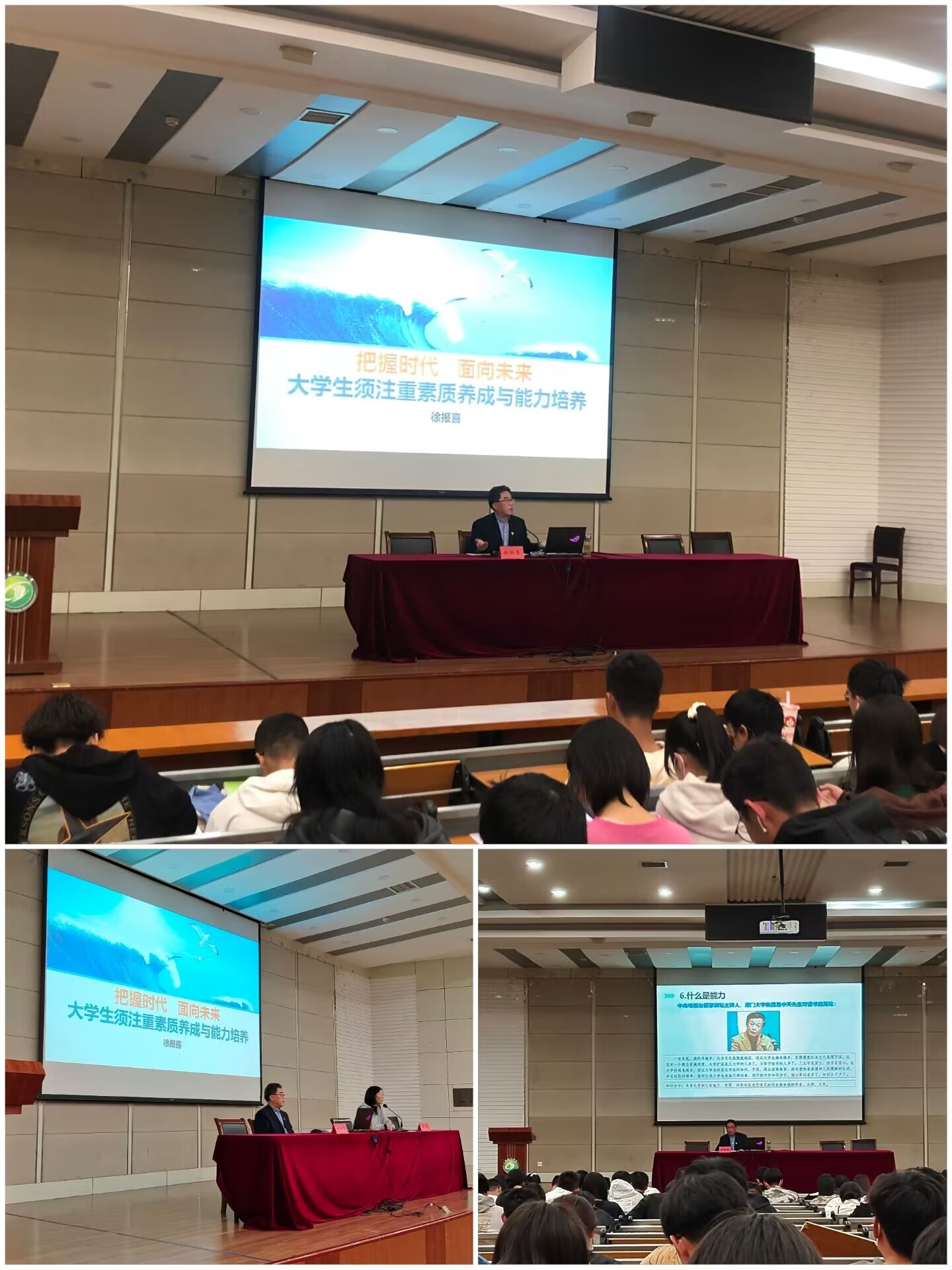 素质教育关乎国家民族的前途与命运,大学生的素养能力是成长成才的根本要求,对打造“教育强国”具有深远的意义。徐报喜分别分析了高中和大学两种不同的教育模式,指导学生进行学习模式的转变,要从高中的“要我学”转变为大学的“我要学”,建议同学们提高学习自觉性,增强学习紧迫感。从思想道德素质、专业知识与智力素质、人文素质、心理与身体素质四个方面,向同学们阐述了“什么是素质”;从综合分析能力、信息真伪辨别能力、人际协调能力、时间安排能力、表达能力和创新创业能力六个方面,详细解读了“什么是能力”。谆谆教导同学们珍惜学习时光,做好大学四年的职业规划,要学会在喧嚣中学习、在热闹中学习,注重培养自身素养与能力,绽放青春的力量。