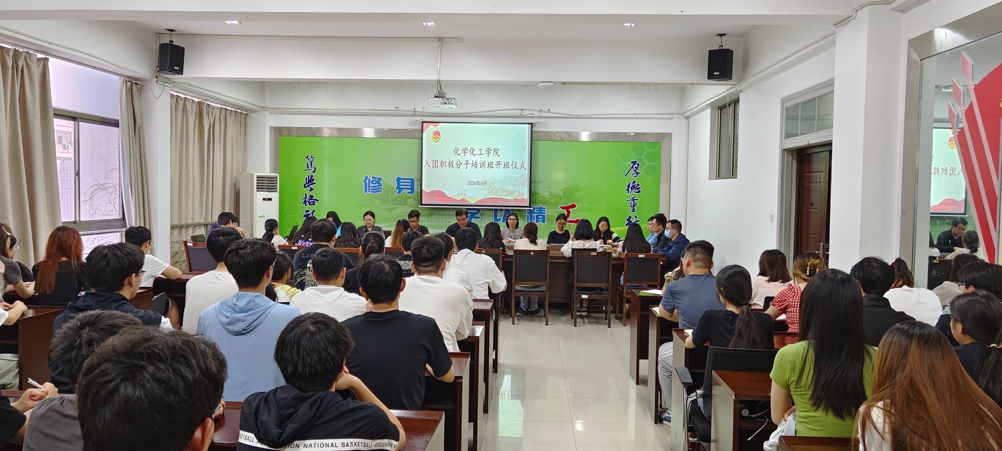 6月6日晚,betway西汉姆联官网团委在“化心筑梦”一站式学生社区举行入团积极分子培训班开班仪式。学院党委副书记江滔、学生工作办公室主任李慧、全体专职辅导员、培训班全体学员,共计90余人参加开班仪式。会议由学院团委副书记王灿星主持。