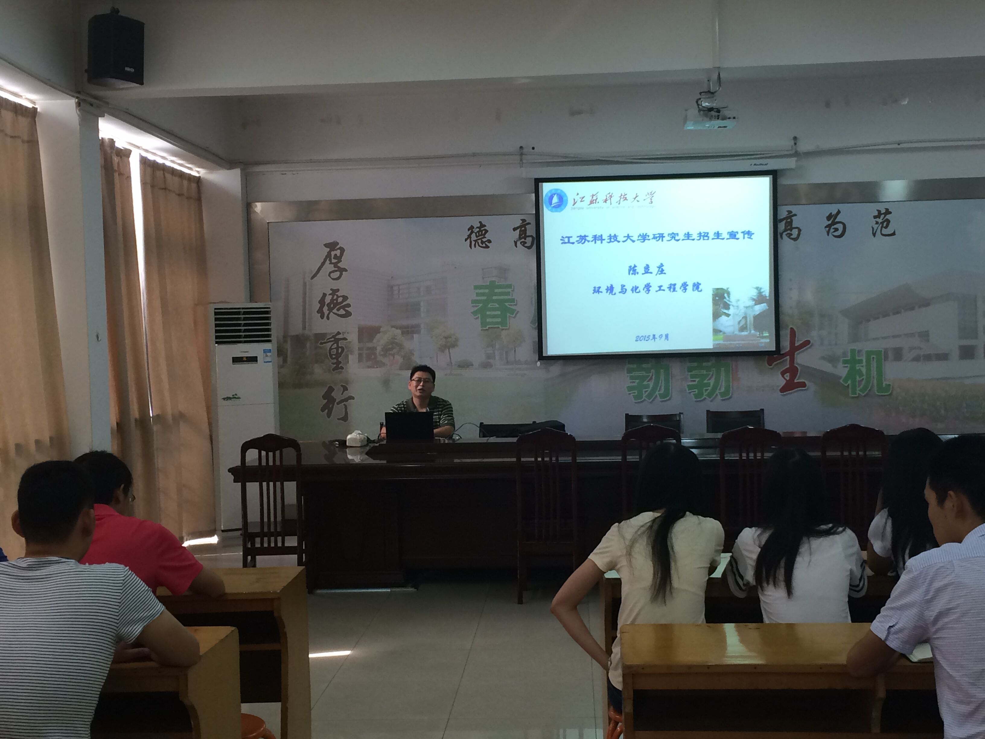 会上,陈立庄副院长从学校概况,学科研究方向,学科团队,科研成果,就业及考博等方面介绍了环境与化学工程学院的基本情况,重点讲解了研究生学费和奖学金政策优惠条件。他鼓励同学们积极报考江苏科技大学的研究生。陈立庄副院长强调,不论报考哪所学校,同学们以后都要认真搞科研,这样才能获得更多的资助,也有助于以后找到更好的工作。