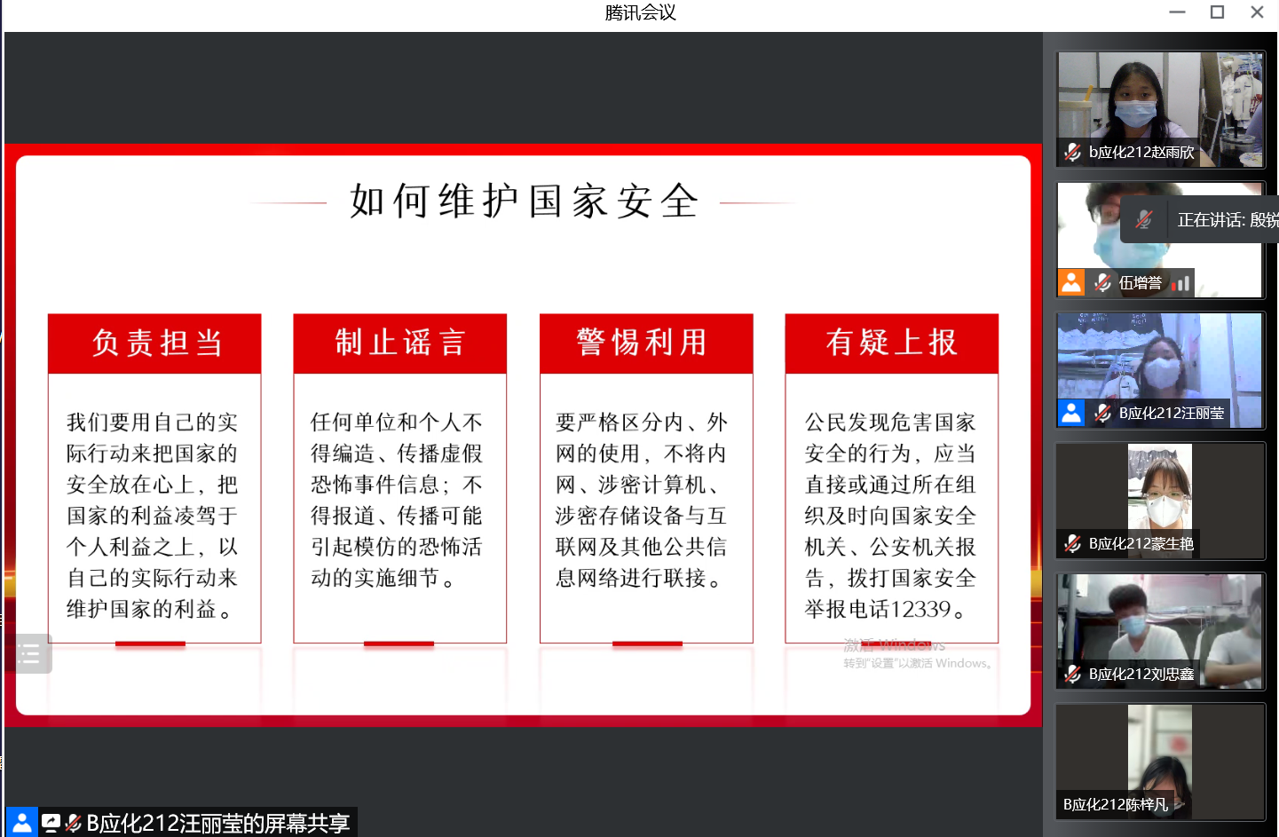 在线上活动中,学院组织师生开展国家安全教育日安全生产线上大讨论、主题“云”班会、在线党团日专题活动等进行交流学习;积极动员师生参与中国普法微信公众号举办的“415”全民国家安全教育日专项答题活动。