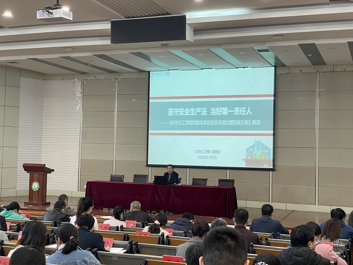 为进一步加强危险化学品安全管理,落细落实校纪委督查问题隐患整改工作,11月2日下午,betway西汉姆联官网在化工楼报告厅开展教师实验室安全教育培训。学院院长戴勇,副院长祁刚、李红波,党委副书记江滔出席,全体教师参加,党委书记高健主持。