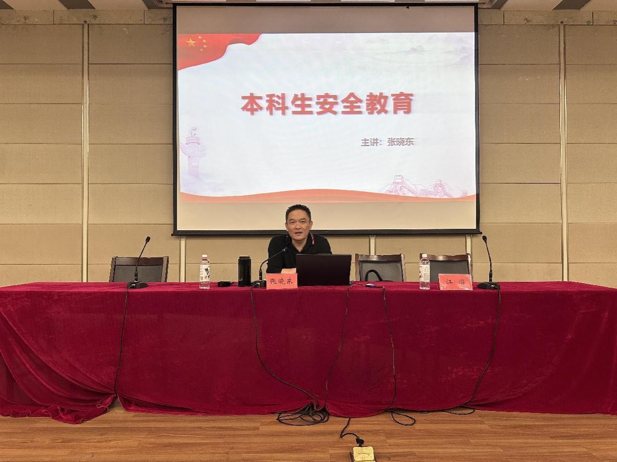 10月10日晚,在化工楼报告厅,学院邀请校党委保卫部部长张晓东为全体大一新生开展大学生安全教育讲座。学院党委副书记江滔主持。
